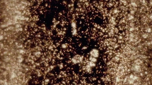 This film is made by some beautiful and unique alchemical transformations of the film material itself. It is a visual expedition into the world of matter, which shows the bizarre richness of the smallest particles floating in the film emulsion. The crystals' constantly changing structures, enriched by the textures, bring about an almost tactile experience, a visual expression of its own base matter.(Jürgen Reble)